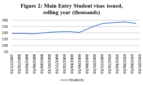 The year to the end of 2008 saw 209,000 main entry student visas issued (excluding student visitors). By the end of 2009 this had risen to 273,000, and the year ending September 2010 saw 275,575 student visas issued. When dependants are included in this number, for the year ending September 2010, the figure rises to a massive 309,000.