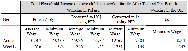 7. An individual in the UK who has a dependant spouse and two children, earning the minimum wage would receive a weekly income, including benefits, of £543, or annually just over £28,200. (See Annex A) Again, if a Polish family made a 20% weekly saving, this would equate to around £110 which is worth 540 in Polish Zloty. In Poland, a person in the same circumstances would have a weekly income of 375 Zloty (after tax and including benefits). (Annex C) Thus, if they could save 20% of their earnings in the UK, they would be saving almost one and a half times what they would have earned in Poland.