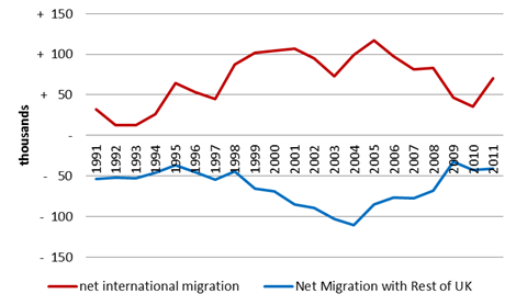 18. Research by Timothy Hatton and Massimiliano Tani found that, for the southern regions of England, for every 100 additional international migrants coming into the area there is a ‘displacement’ of 44 others to location elsewhere in the UK[23]. Research from the London School of Economics has demonstrated that the levels of international migration to the UK are mirrored by net internal migration out of London[24]. This is illustrated in figure 5 below:
