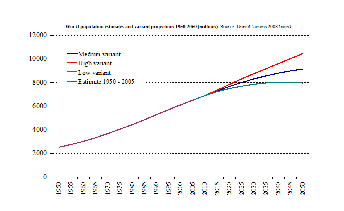 8. The United Nations medium projection of world population is that it will grow from today’s 6.7 billion (2008) to reach 9.1 billion by 2050 and stabilise at between 9 and ten billion in the latter half of this century. Much of the projected increase of about 3 billion is inevitable, as a result of population momentum. The rest depends on assumptions about the continued decline of mortality and fertility.